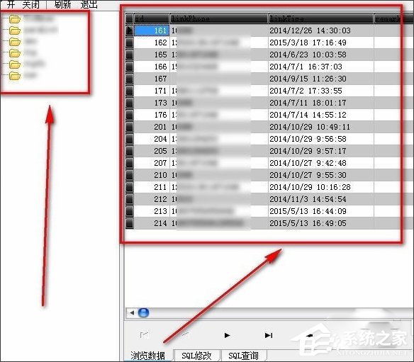 1.3在软件窗口的左侧可以看到数据库文件中包括的数据表的名称列表,点击某个数据表,就可以在右侧看到表中的数据。