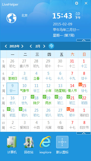 LiveHelper是一款免费、绿色的桌面历软件,提供万年历、天气,时间等便捷生活信息, LiveHelper致力于为用户提供贴心的电脑使用体验。