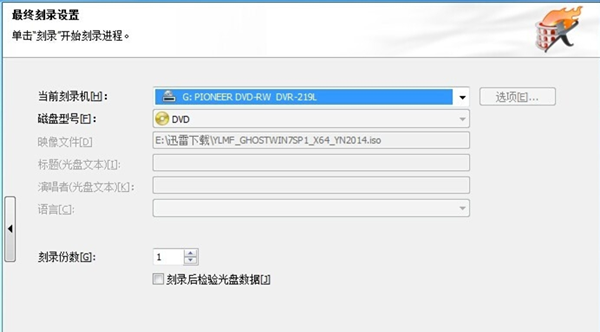 5、进入刻录设置界面,我们先选择刻录机,然后设置磁盘型号、刻录份数等其他信息,设置完成确认无误后点击刻录。