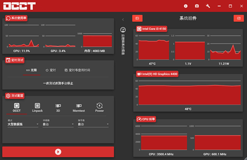 OCCT中文Beta版是一款专业的电源品质测试软件,OCCT主要测试电脑主机电源的负载能力及稳定性,并且OCCT拥有一个监控引擎,可以完整的计算出测试的数据,而且OCCT拥有安全防护机制,防止测试过头损坏硬件。