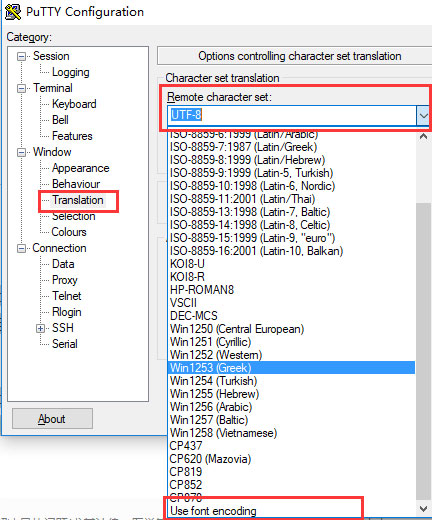 2、然后切换至“Window”下的“Translation”选项,打开“Remote character set”的选择框,在下拉菜单中选中“Use font encoding”,之后在按照常规方式建立连接即可。