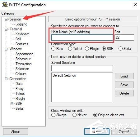 1、打开Putty,在“Session”标签下,对“Host Name (or IP address)”的输入框中输入想要访问的主机名或IP地址,比如server1或192.168.9.4。端口号(Port)会依据下方选择的协议有所区别,用户需要根据服务器来进行选择;
