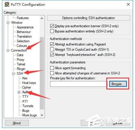3、之后点击切换至“Connection”下“SSH”目录中的“Auth”功能页,点击“Browse”按钮,选择Putty密钥文件,之后建立连接即可。