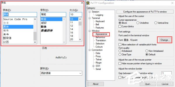 1、打开Putty,点击“Window”下的“Appearance”选项,点击“Font settings”后的“Change”按钮。这样会打开字体设置窗口,选择一款中》文字体,然后在下方“脚本”栏中选择“中文_GB2312”;