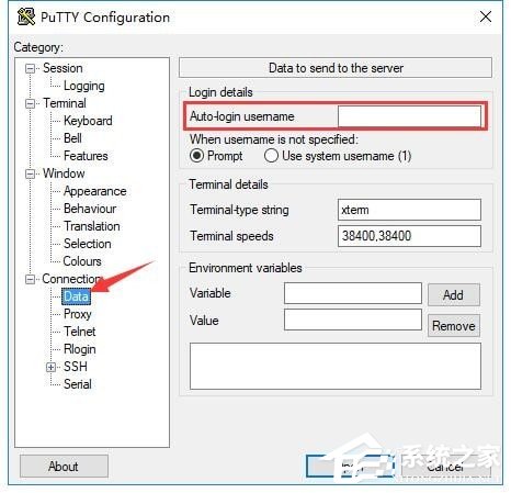 2、切换至“Connection”下的“Data”选项下,在“Auto-login username”后输入登录所用的用户名;