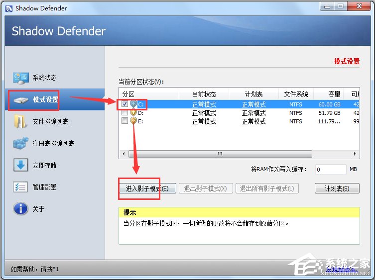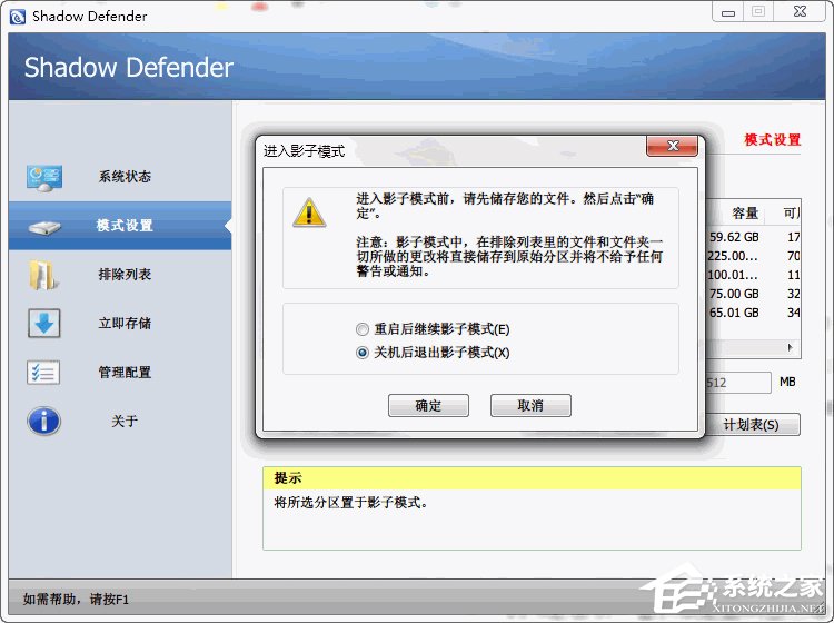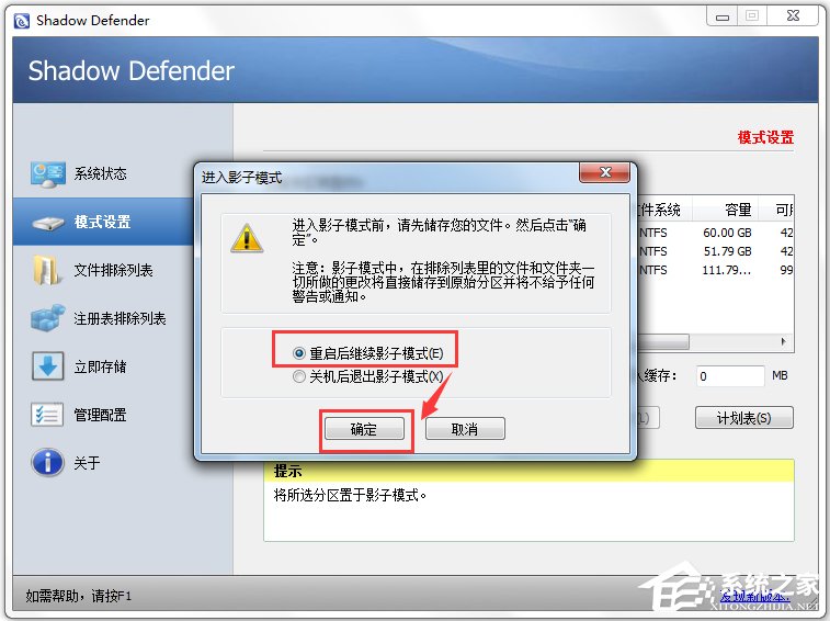 a.在「模式设置」中勾选想要进入影子模式的分区后,软件会让你选择:重启后“继续生效影子模式”还是关闭之。如果每次开机都想让PC运行在初始的最佳状态,推荐选择“继续”。