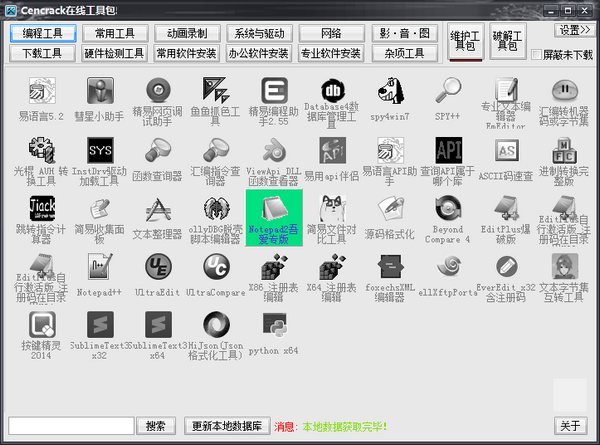 易语言5.2、foxechsXML 编辑器、X64_注册表编辑、X86_注册表编辑、UltraCompare、UltraEdit、Notepad++、EditPlus自行激活版_注册码在目录里X64、EditPlus自行激活版_注册码在目录里X84、EditPlus爆破版、Beyond Compare 4、源码格式化、简易文件对比工具、Notepad2吾爱专版、ollyDBG脱壳脚本编辑器、文本整理器、简易收集面板、跳转指令计算器、进制转换完整版、ASCII码速查、查询API属于哪个库、易语言API助手、易用api伴侣、ViewApi_DLL函数查看器、汇编指令查询器、函数查询器、InstDrv驱动加载工具、光棍 AUH 转换工具、汇编转机器码或字节集、专业文本编辑器 EmEditor、SPY++、exe打包工具、spy4win7、Database4数据库管理工具、精易编程助手2.55、鱼鱼抓色工具、精易网页调试助手、彗星小助手等等等。