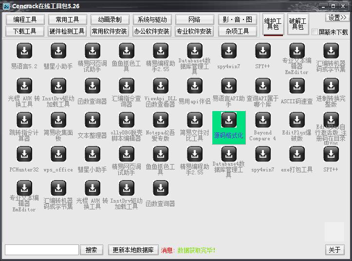 cencrack在线工具包是一款非常好用的办公应用软件,这款软件功能丰富,提供编程工具、常用工具、媒体工具、下载工具、硬件检测工具、办公软件等多种分类,有了这款软件,能轻松的帮助你解决各种问题,操作简单,占用内存小,有需要的用户快来下载吧!