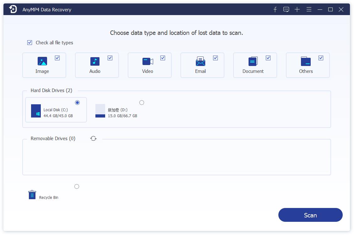AnyMP4 Data Recovery是专业且安全的数据恢复软件。它可以帮助您轻松地从计算机驱动器,闪存驱动器,移动电话或相机上的存储卡/存储棒中还原几乎所有丢失的文件,如照片,文档,电子邮件,音频,视频等。无论您是丢失了要删除的文件,进行格式化等,还是由于系统崩溃,病毒攻击等原因丢失了数据,也可以使用此功能强大的数据检索程序来为您提供帮助。
