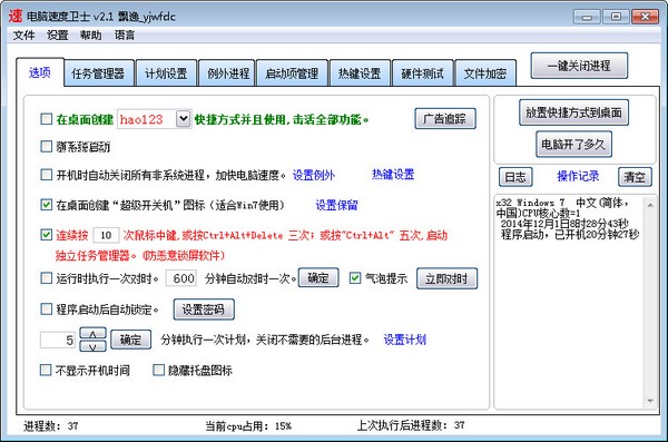 电脑速度卫士是一个增强型的Windows任务管理器工具,它能显示每个进程的路径和操作日志,还可以一键关闭进程。计划管理功能支持自定义开机启动项,并且每一项都有相关操作日志。例外进程支持将系统进程和关键进程添加到列表中,一键关闭的时候就可以将这些进程排除在外。这个工具无论对电脑新手还是熟悉电脑操作的人来说都非常方便,欢迎下载使用。