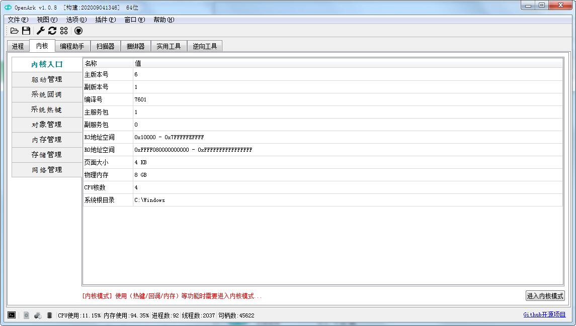 内核 - 系统内核工具,例如:驱动、回调、过滤器、IDT/SDT WFP等功能,以后会支持更多。
