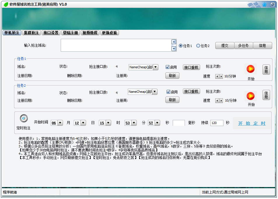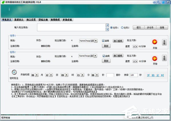 “多任务按钮”:当域名需要注册的域名多于2个的时候,按照指定格式导入参数,这种情况下,任务1和任务2两个通道不启用。