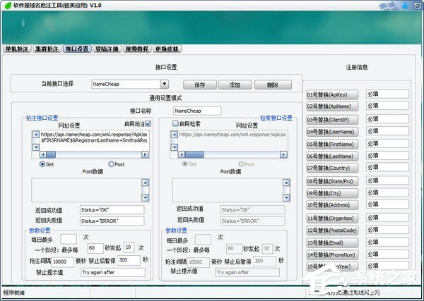 注册信息:“1-15号注册信息”编辑框:用来替换替换符的内容,以1号(ApiKey)为例,括号捏为替换符的简写,编辑框内容例如填入“NameCheap”,任何位置出现的$APIKEY$都会被替换为“NameCheap”,其余同理。