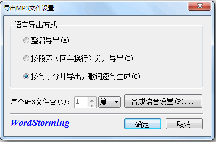 点击“导出Mp3”按钮可以中英文对照文章导出为Mp3,导出时还可以有多种选项,可以按段或按句逐段或逐句对照导出,还可以调整导出的语音和语速(合成语音设置):