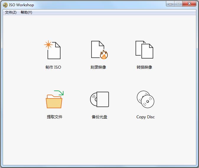 ISO Workshop操作简洁,主界面有四个大图标:从ISO提取文件、备份光盘镜像数据、转换ISO到其他镜像格式、刻录ISO到CD或DVD光盘。