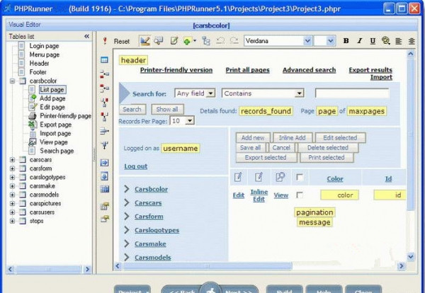 PHRunner中的所见即所得视觉编辑器可让您轻松自定义应用程序的外观和风格。PHPRunner将向您介绍每个页面的建议布局。但是,页面上的所有元素都可以轻松修改。可视化编辑器允许您在页面上拖放,复制和粘贴对象。对于页面上的所有字段和标签,您可以更改字体,大小,颜色,样式,缩进和对齐方式。视觉编辑器允许您跳转到生成的HTML代码,并在那里进行修改。