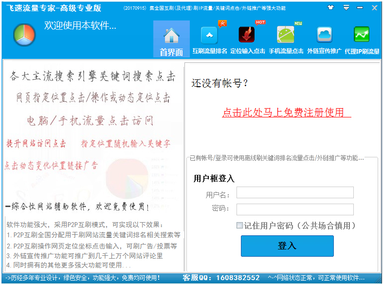 飞速流量专家是刷网站关键字排名、网站排名优化、刷网站流量软件功能强大,可适用于刷网站综合排名、刷百度相关搜索、关键词排名、恶意刷竞争对手推广广告等,软件以互刷模式进行智能翻页精确点击,强大的伪造来路地址等功能皆为业内首家实现。