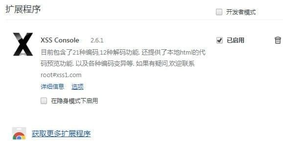 XSS Console Chrome是一款可以安装到谷歌浏览器上使用并支持所有chrome内核浏览器安装操作的编码编译插件,使用这款XSS Console插件可以让你快速的编译指定内容,它目前包含了21种编码,12种解码功能,还提供了本地Html的代码预览功能。
