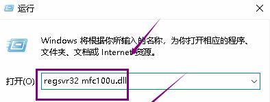 5、在运行框中输入命令注册mfc100u、dll,然后单击“确定”按钮以重新启动软件,如下所示。