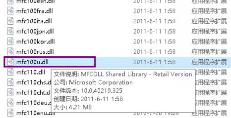 2、下载后,解压缩mfc100u、dll文件,并如下所示复制该文件。