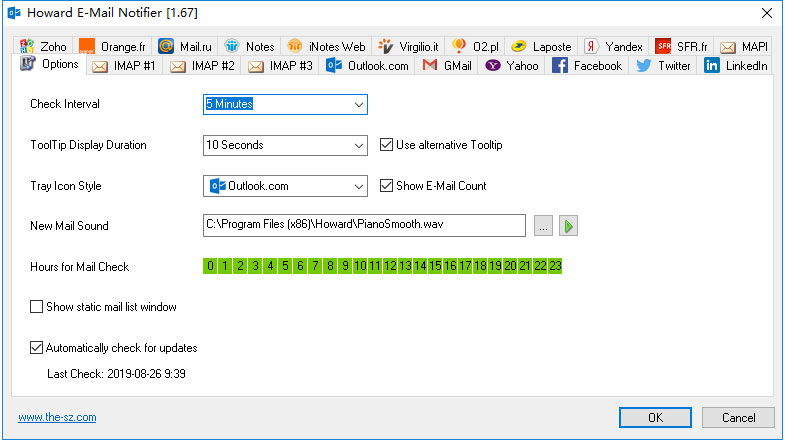 Howard Email Notifier是一个非微软官方的免费工具,Howard Email Notifier官方版可以用来取代Windows Live Messenger的邮件提醒功能,同时支持Outlook.com, live.com和hotmail.com邮箱的新邮件检测。