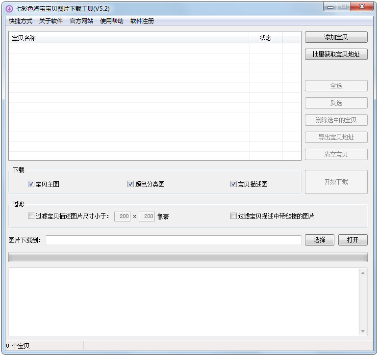 七彩色淘宝宝贝图片下载工具,下载淘宝宝贝图片很方便,可以下载淘宝和天猫的宝贝主图、颜色分类图(销售属性图)、宝贝描述图。
