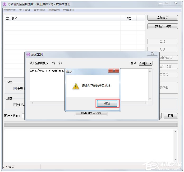 5、如果地址错误的话,会出现提示输入正确宝贝地址,点击确定;