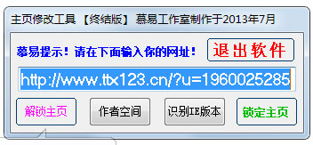主页修改工具终结版是一款能够修改浏览器主页的软件,打开这款软件后默认会设置软件作者网站为主页,如果不喜欢可以点击“解锁主页”,然后再设置自己喜欢的网站点击“锁定主页”即可。同时这款软件还具有一个识别IE版本的功能。
