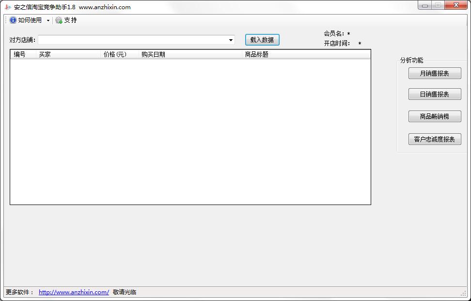 第一次使用,找到竞争对手的评价网址,比如这样的页面:http://rate.taobao.com/user-rate-c8eb42c587c9101da5f54f6918b6df4b.htm,复制到软件的店铺输入框里,点击载入数据按钮,待软件分析完毕后,做出 分析完毕 的提示,您就可以使用软件提供的 月销售报表,日销售报表,商品畅销榜,客户忠诚度 等的功能了。