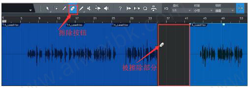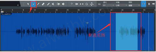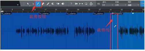 如图所示,裁剪I具位于Studio One_工具栏左数第三个位置。点击按钮选中裁剪I具,此时鼠标的作用相当于剪刀。