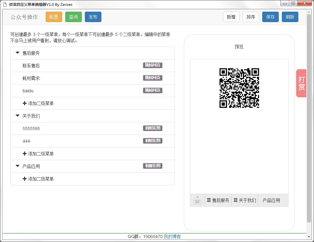 5、新增、排序、保存、刷新等操作都是针对本地菜单文件,最后需要点击发布按钮才能在公众号上创建菜单。