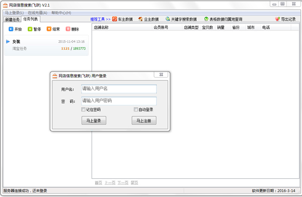 1、软件可以采集到店铺名称,会号账号,店铺类型,宝贝数量,销量,省份,城市,电话等。
