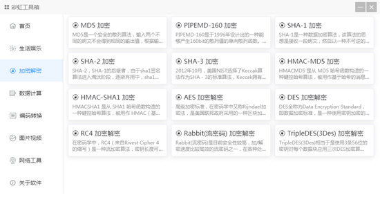 md5加密、PIPEMD-160加密、SHA-1加密、SHA-2加密、SHA-3加密、HMAC-MD5加密、HMAC-SHA1加密、AES加密解密、DES加密解密、RC4加密解密、rabbit流密码加密解密、tripledes加密解密。