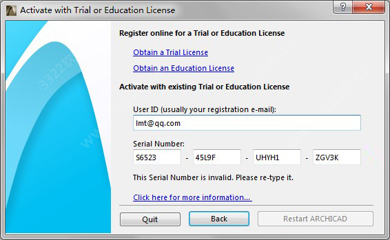 7、如图所示,这里输入任意用户邮箱和序列号S6523-45L9F-UHYH1-ZGV3K,点击重启软件;