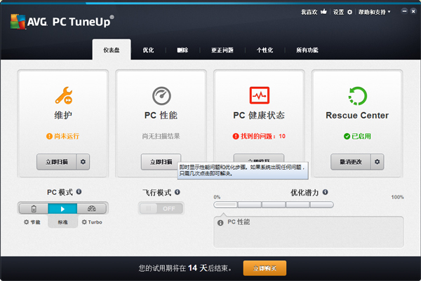 AVG是很知名安全软件厂商,已有着十几年杀毒软件开发的经验。AVG PC Tuneup是该公司推出的一款PC维护类软件,涵盖其它系统优化软件的所有功能,可以自动查找和修复影响计算机启动和运行缓存的问题,清理用户使用痕迹,使计算机运行的更快,更稳定!