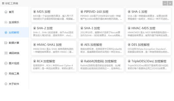 提供MD5加密、PIPEMD-160加密、AES加密解密等小工具。