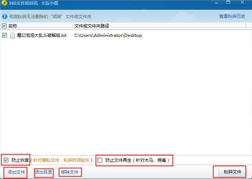 答:能,因为包含在360杀毒和360安全卫士中,可供用户删除指定的文件,并且能够让用户选择“粉碎后禁止还原”和“粉碎后禁止再生”两种强制选项。