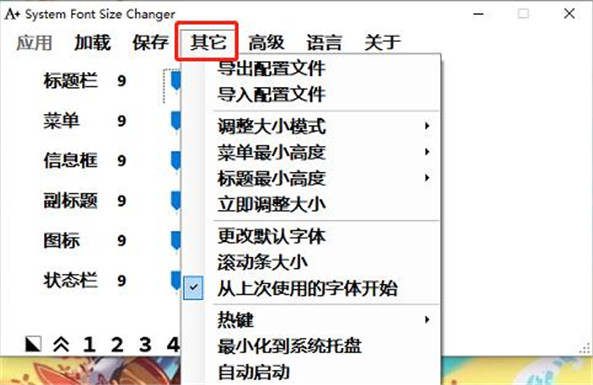 5、在其他选项下,支持导出配置文件、导入配置文件、调整大小模式、菜单最小高度、标题最小高度、立即调整大小、更改默认字体、滚动条大小、从上次使用的字体开始等功能选项。