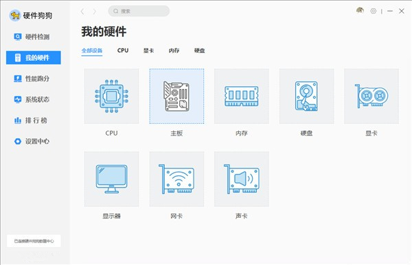 2、启动首页,即是“我的电脑”硬件概览。在这里,硬件狗狗展示了系统版本、激活状态、CPU、内存、显卡、主板、硬盘、显示器、声卡、网卡等主要硬件核心信息,让普通用户也能对自己的电脑状态一目了然。