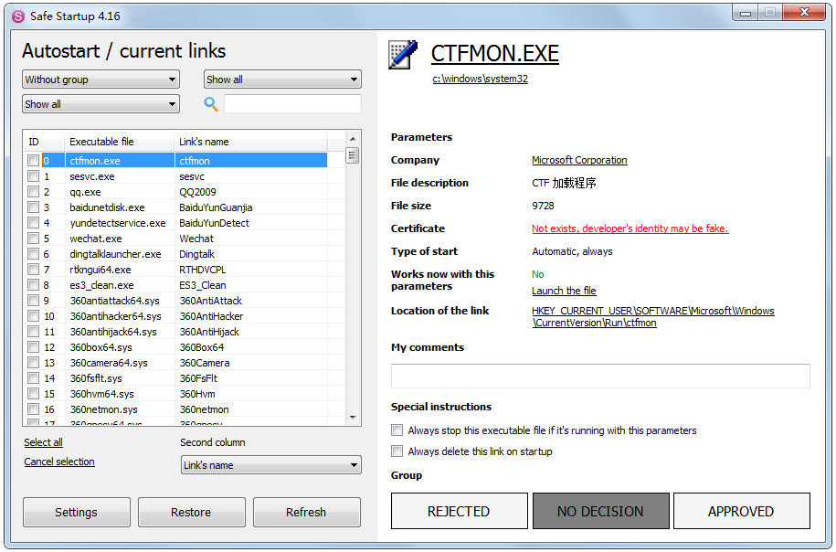 除了可以禁用和重新启用自动启动条目外,“安全启动”还使您可以添加个人注释,一键启动该文件,而无需离开程序界面,如果运行该可执行文件,则始终将其停止当前设置的参数,或者始终在启动时删除链接。
