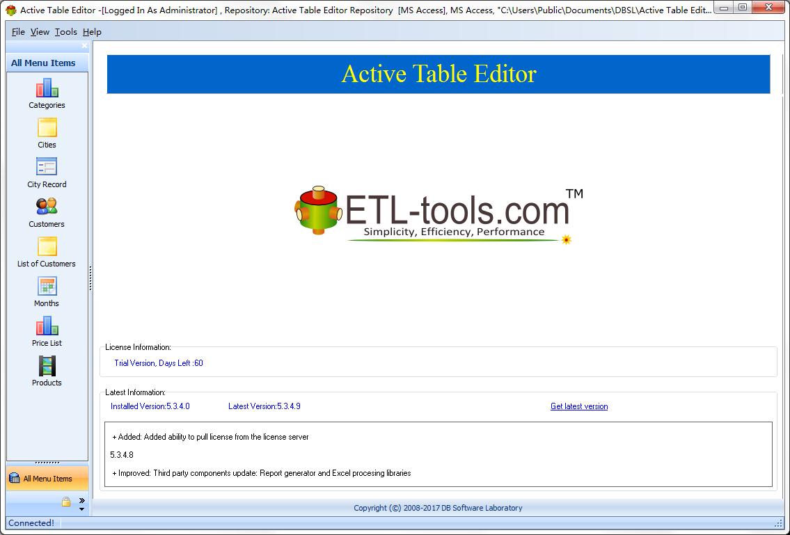 此外,您可以在Active Table Editor的帮助下轻松连接到数据库服务器并为最终用户调整其布局。作为管理员,您可以创建用户帐户,设置密码并更改他们使用数据库的方式。此外,您可以将某个表,信息段或整个数据库导出到CSV,TAB,HTML或Excel文件。