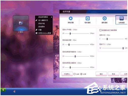 全景桌面能替换系统桌面,在空白处双击左键可进行切换。选中“桌面壁纸进行高斯模糊”,背景会变模糊。图标太多,可以放到这里,让系统桌面保持清洁。右键调出菜单,可以进行设置。