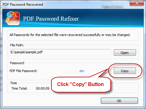 成功恢复密码后,将弹出一个对话框通知您密码。然后您可以单击“复制”按钮并粘贴密码以打开受密码保护的PDF文档。