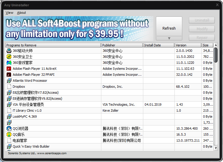 soft4boost任何卸载程序帮助你卸载软件和删除不需要的或损坏的程序。分析程序的数据在程序的卸载后残余卸载和扫描。现在,您可以使用三种不同的模式来卸载,修改和修补程序和没有解决卸载问题。此外,它还提供世界各地的用户越来越多的语言包。soft4boost任何卸载是兼容的办公,图形,杀毒软件和其他软件。