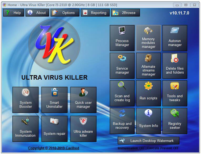 ultra virus killer是款专业强大的病毒清除和系统修复软件。ultra virus killer为用户提供最为实用直观的操作界面,能够帮助用户检测到所有类型的恶意软件以及间谍软件,同时还可删除受感染的系统,大量实用的修复工具,为你的系统安全做保障。