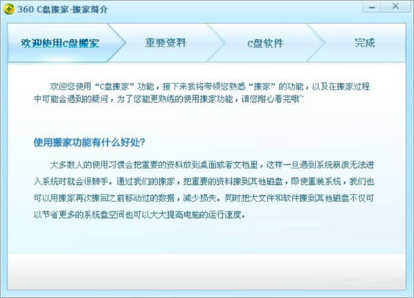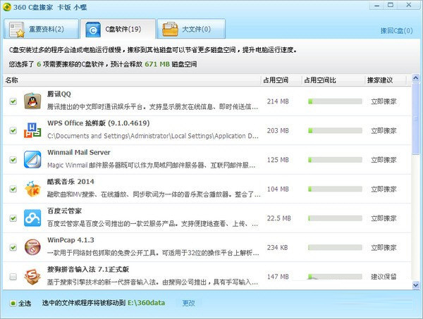 1、360C盘搬家绿色独立版有自己单独的窗口界面,分为“重要资料”和“c盘软件”两部分。和其他搬家工具不同,360独有“搬家建议”,会智能识别文件,对于可以搬家的软件会建议用户“立即搬家”、“可以搬家”,而对于一些搬家后容易出现故障的软件,360则会提示用户“建议保留”,避免盲目搬家带来的恶果。