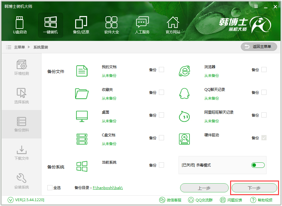 3、进入“备份资料”,选择你需要备份的文件,在此韩博士将为你的电脑进行备份,然后点击下一步;