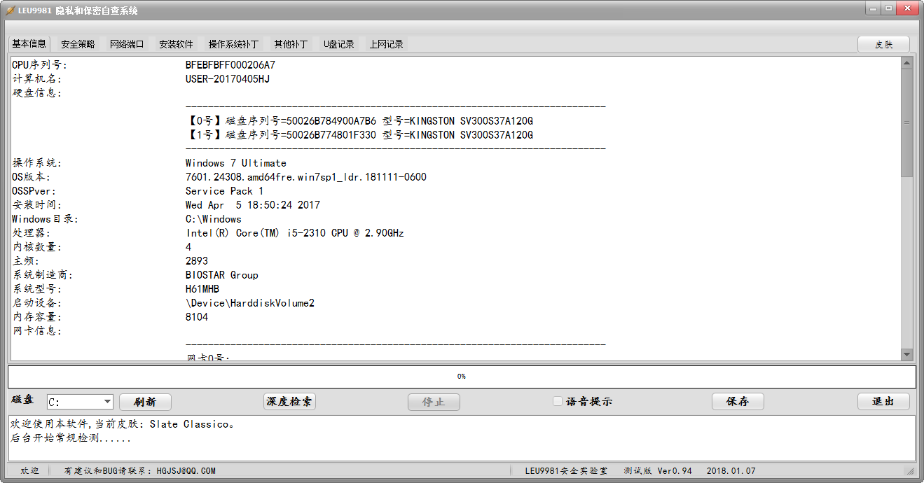 Leu9981隐私和保密自查系统是一款免费的系统保密自查工具,现在的大数据环境越来越危险了,各种病毒和木马横行而侵害用户的隐私,这款工具可以帮你深度清理上网痕迹,还能检索USB痕迹,让你可以发现电脑USB的连接痕迹。