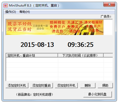 minishutoff一款小巧的定时关机软件。可设定当日、每天、每周、每月关机(重启)时间,也可根据每次开机运行时间设置关机(重启)。支持开机后自动启动(通过“菜单-自动启动”进行设置),可隐藏为桌面右下角小图标,支持倒计时与邮件通知。