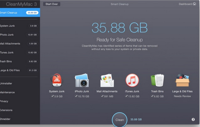 CleanMyMac 3具有专业的清理系统、优化实用程序和健康通知等,它可以让您一键快速清理您的Mac系统、扫描旧文件、删除应用程序和垃圾文件、维护脚本、监控Mac的运行状况等等。